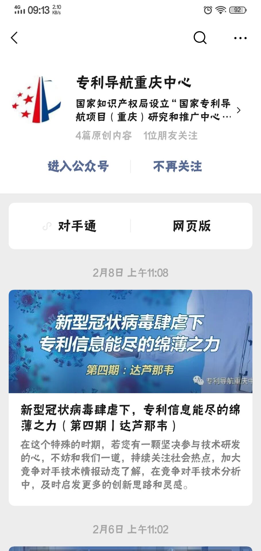 首先,需要打開您的微信:找到|“公眾號(hào)”,點(diǎn)擊進(jìn)去,點(diǎn)擊上方“+”號(hào),輸入:“專利導(dǎo)航重慶中心”,點(diǎn)擊關(guān)注。