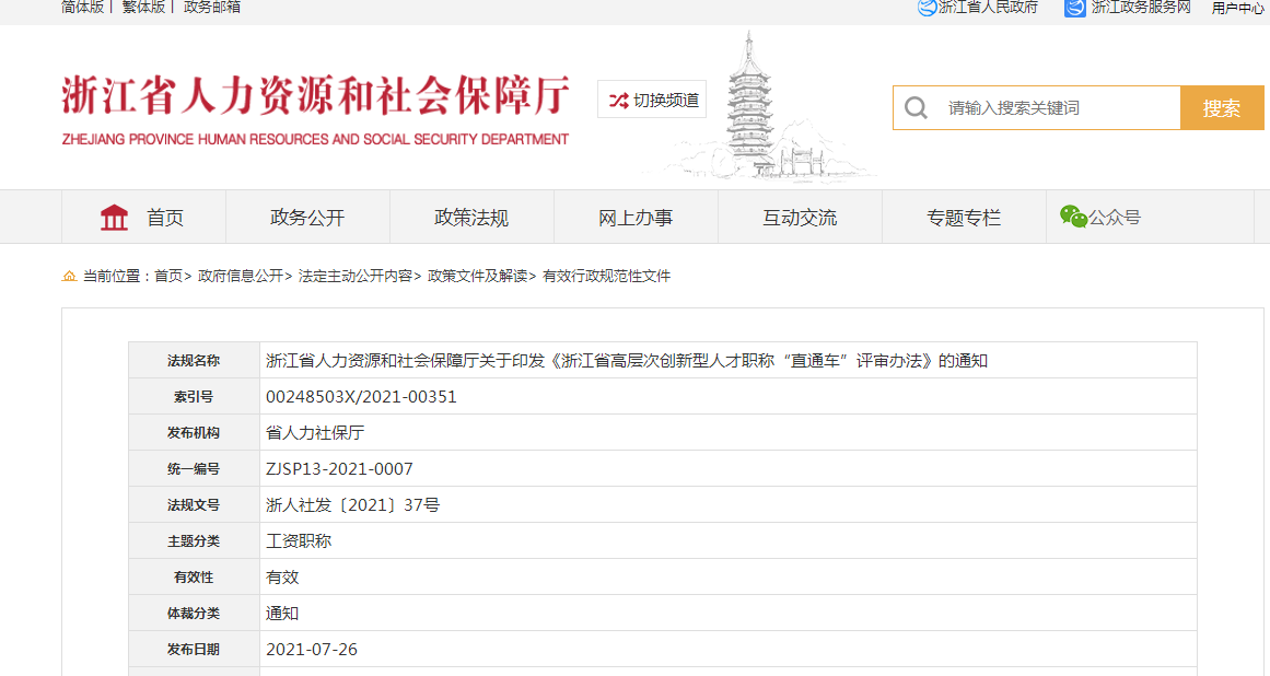 【浙江】浙江省人力資源和社會(huì)保障廳發(fā)布《浙江省高層次創(chuàng)新型人才職稱“直通車”評(píng)審辦法》(http://rlsbt.zj.gov.cn/):