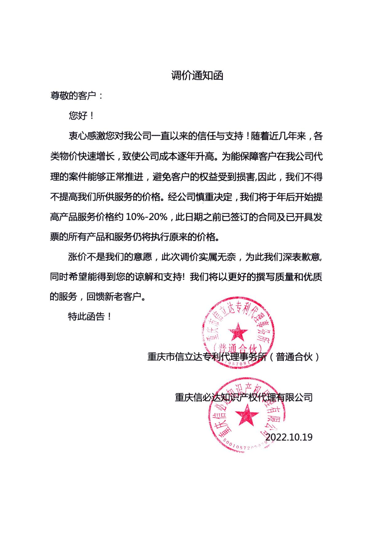 衷心感激您對我公司一直以來的信任與支持!隨著近幾年來,各類物價(jià)快速增長,致使公司成本逐年升高。為能保障客戶在我公司代理的案件能夠正常推進(jìn),避免客戶的權(quán)益受到損害,因此,我們不得不提高我們所供服務(wù)的價(jià)格。經(jīng)公司慎重決定,我們將于年后開始提高產(chǎn)品服務(wù)價(jià)格約10%-20%,此日期之前已簽訂的合同及已開具發(fā)票的所有產(chǎn)品和服務(wù)仍將執(zhí)行原來的價(jià)格。